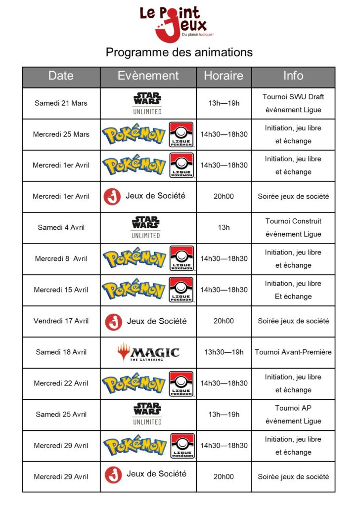 Débranchez vos télé et venez jouer! Le programme des animations de la boutique jusqu'à fin avril, soirée jeux, tournois, initiation,... pour plus d'info nous contacter…